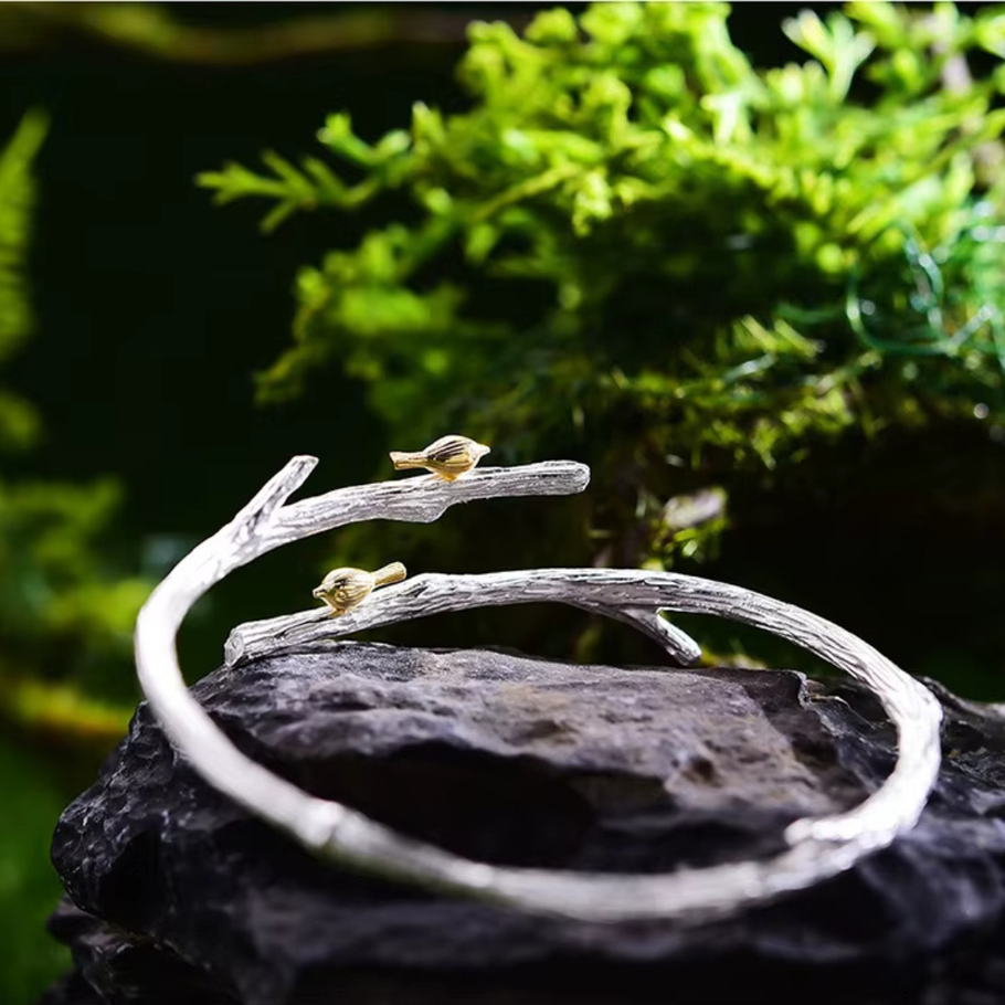 Confeccionado em Prata 925, o bracelete recebe detalhes em banho de Ouro 18K, que iluminam a peça com sutileza e contraste refinado. Seu acabamento cuidadoso valoriza as texturas orgânicas do metal, reforçando a sensação de joia artesanal com alto valor estético.